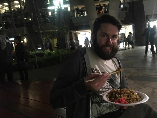 By this time we were pretty dang hungry, considering Hawaii time is three hours earlier than Arizona time, our airplane snack game was not on point, and we had not eaten dinner yet. Now that the parade was over and we could cross the street, we wandered our way over to the Pa’ina Lanai Food Court where we grabbed some Teriyaki Chicken and Yakisoba. Once we had our food, we went downstairs and sat down on the edge of the little performance stage in yet another dreamy garden court area. Being extra hungry made it extra delicious.