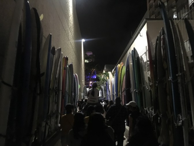 Full and dreamy eyed, we made our way toward to beach, and happened upon a really neat alleyway lined with surf boards on either side, that let out right on the sand. Even on a starless night, the beach and ocean were breathtaking. Walking closer toward the water, behind us was a city and buildings and a whole island of people and lights, and before us was nothing but water and darkness. And apparently three boats filled with copious amounts of fireworks.