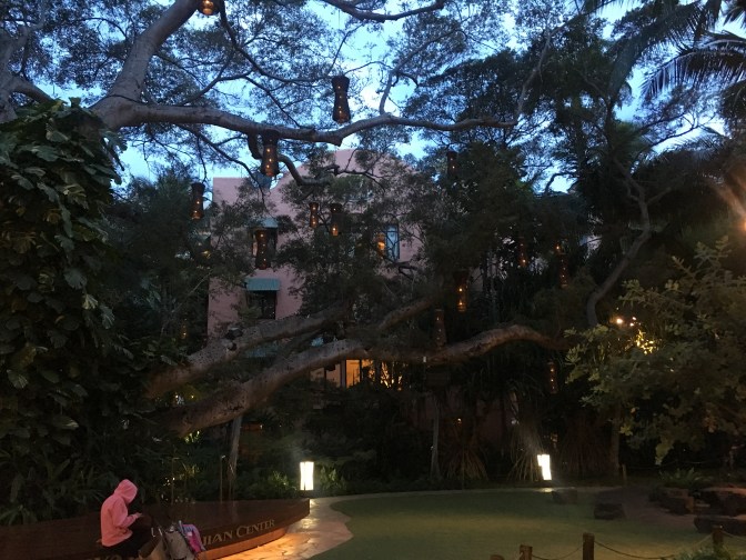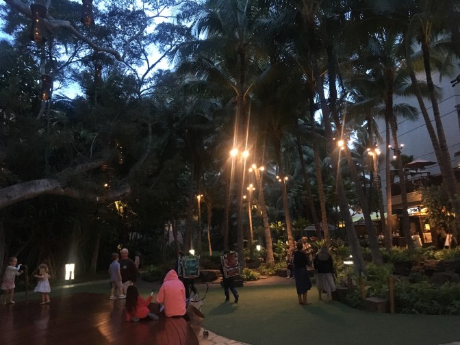 By this time we were pretty dang hungry, considering Hawaii time is three hours earlier than Arizona time, our airplane snack game was not on point, and we had not eaten dinner yet. Now that the parade was over and we could cross the street, we wandered our way over to the Pa’ina Lanai Food Court where we grabbed some Teriyaki Chicken and Yakisoba. Once we had our food, we went downstairs and sat down on the edge of the little performance stage in yet another dreamy garden court area. Being extra hungry made it extra delicious.