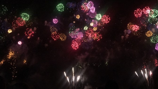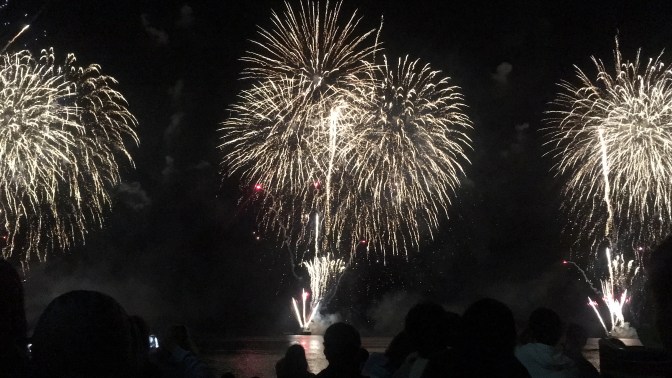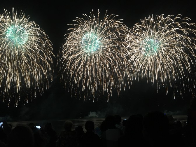 Show time. Fireworks started firing from one boat. They were so close! It was so pretty watching them not only burst in the sky in syncopation with the music, but also seeing how they lit up the sea beneath. They went on for a while, and at one point we thought they might be done. NOPE! Fireworks starting going off from THREE boats now! You know that shout Maui does in the movie Moana? There was a lot of that going on. People ‘oohed’ and ‘aahed’ in roars! We felt like we were surrounded, like being in a snow globe of fireworks! They were non-stop, they were AMAZING, they were THE BEST FIREWORKS WE HAD EVER SEEN!!! 10/10 would watch again. Our pictures don’t even begin to do them justice.
