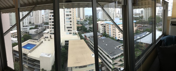 Really though, we have a cute little place over here in Honolulu, Hawaii. We are in the middle of the city, right below the Ala Wai Canal, and are just a short walk to Waikiki Beach. We are 11 stories up in a cozy little studio apartment, though the owners prefer to call it an “open concept.” One of the best things about it is that, although small, it is a corner apartment, and we must say, having windows on two whole walls makes for a pretty gorgeous view!