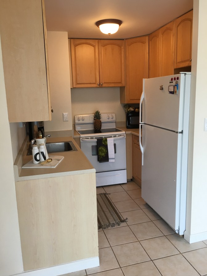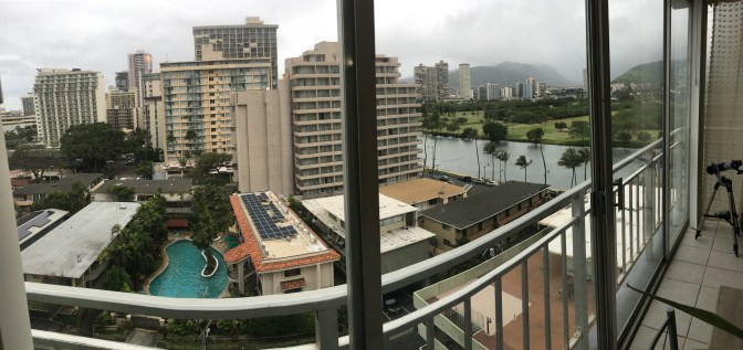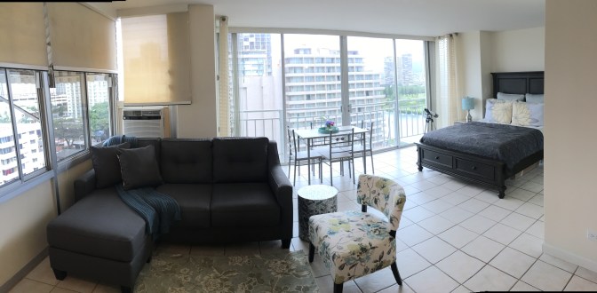 Really though, we have a cute little place over here in Honolulu, Hawaii. We are in the middle of the city, right below the Ala Wai Canal, and are just a short walk to Waikiki Beach. We are 11 stories up in a cozy little studio apartment, though the owners prefer to call it an “open concept.” One of the best things about it is that, although small, it is a corner apartment, and we must say, having windows on two whole walls makes for a pretty gorgeous view!