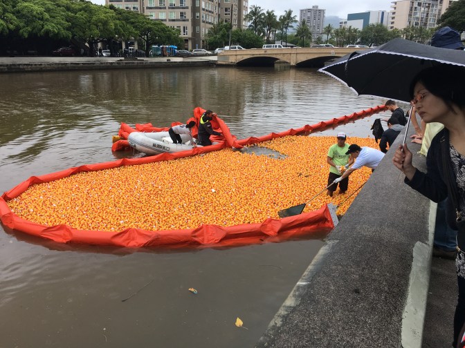 We had heard about this event online, the United Cerebral Palsy Association of Hawaii’s annual Great Hawaiian Rubber Duckie Race, and frankly it sounded awesome! So we made it one of the first things on our list of to-do’s that weekend. Before the race, people could adopt a duck for a donation and place a name tag on their duck, and if their duck was one of the first 50 past the finish line, their owners could win prizes. When race time came, they released thousands of rubber ducks into the Ala Wai canal, and people watched them make their way down the waterway. Afterwards, I was quite impressed with the cleanup process and how efficiently they were able to gather the thousands of ducks. I didn’t see even one escape!